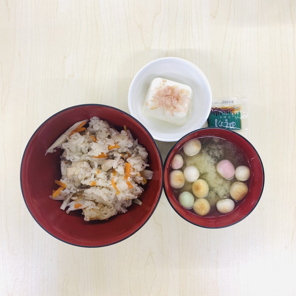 本日の献立:炊き込みご飯、わかめと麩の味噌汁、冷奴