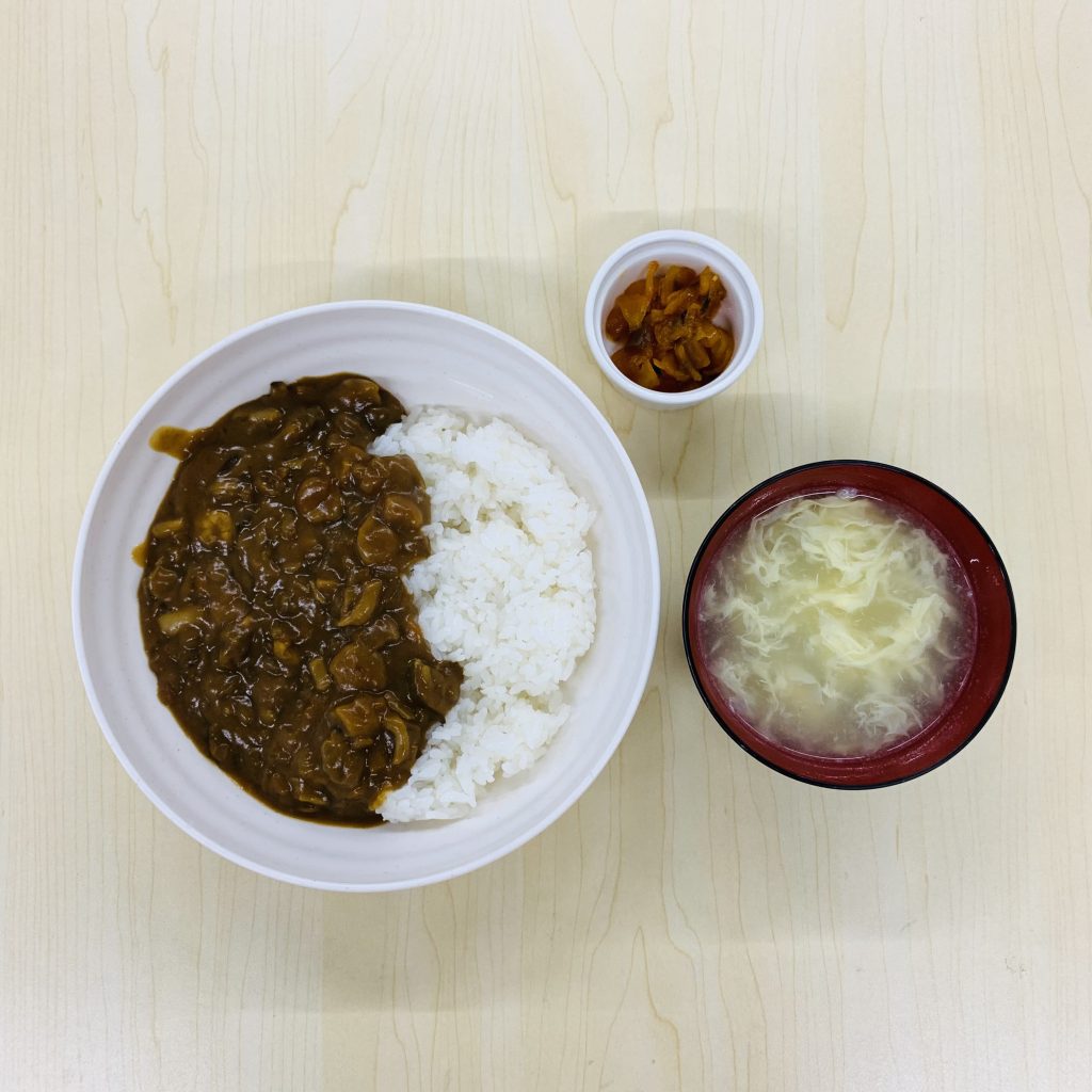 本日の献立:シーフードカレー、玉子スープ、福神漬け