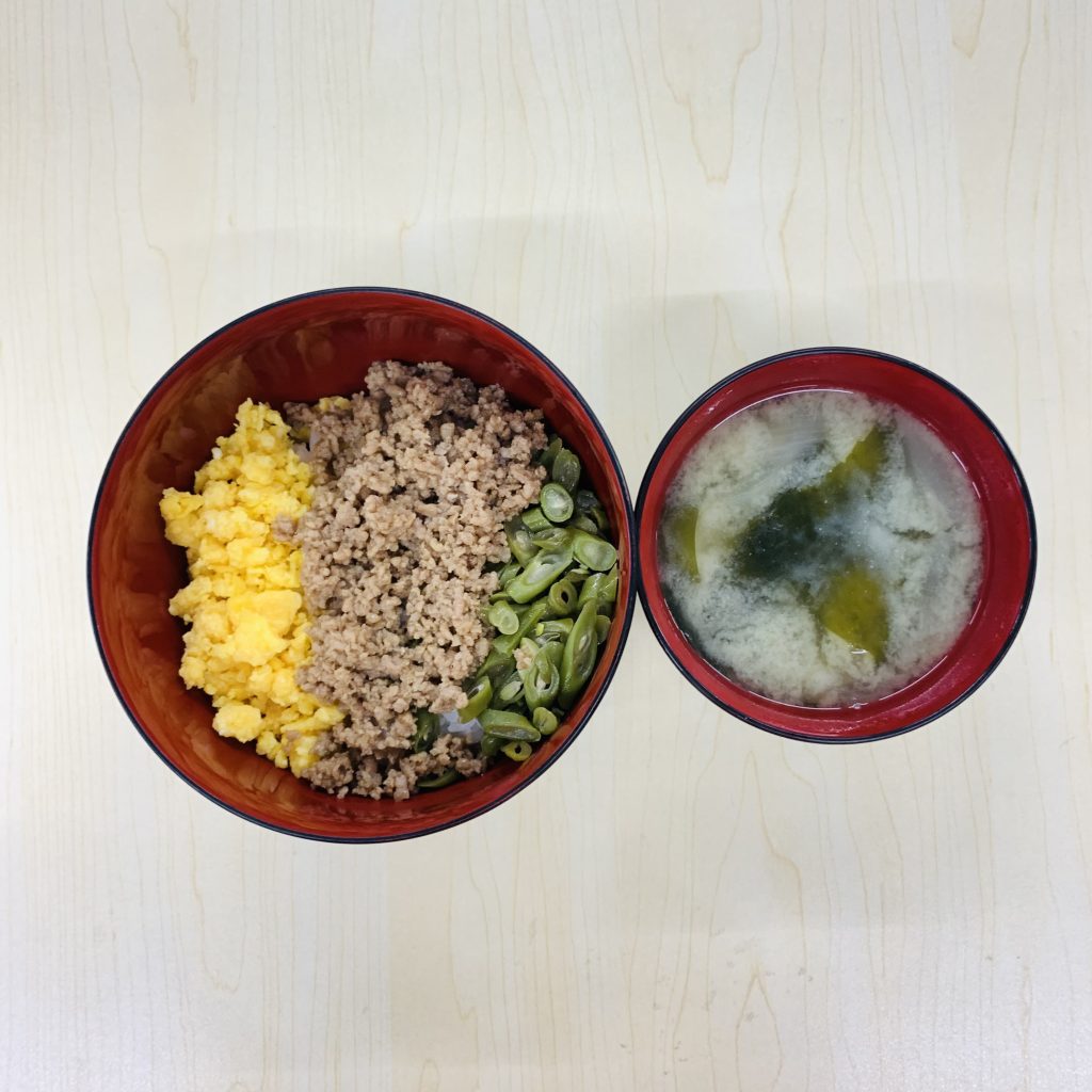 本日の献立:三色丼、わかめの味噌汁