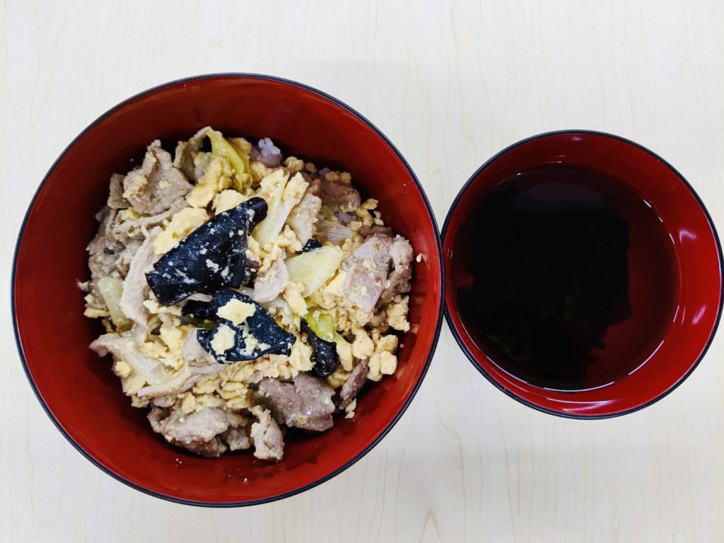 本日の献立:豚肉ときくらげの卵炒め丼、冷たいわかめ澄まし汁