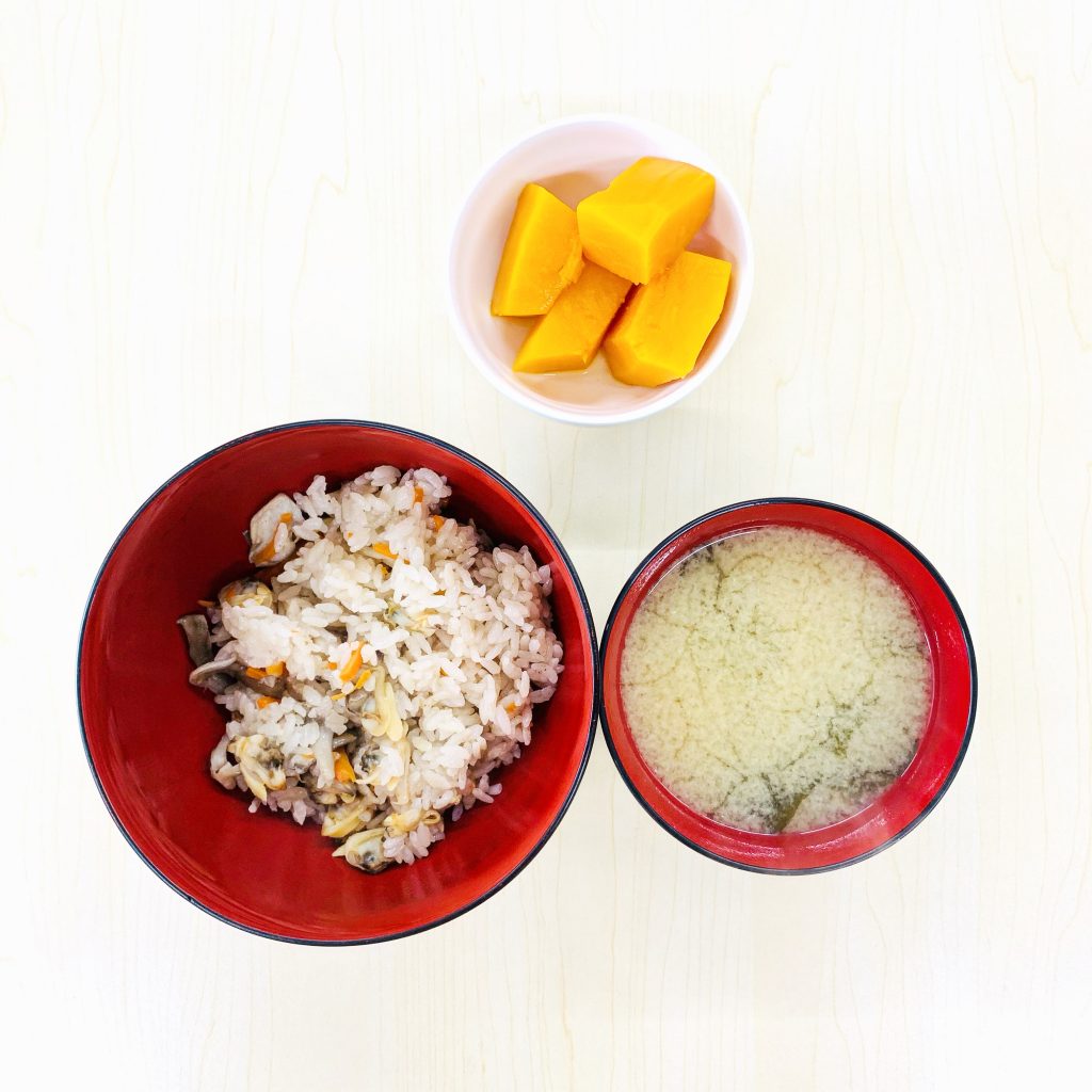 本日の献立:あさりの炊き込みご飯、わかめの味噌汁、かぼちゃの煮物