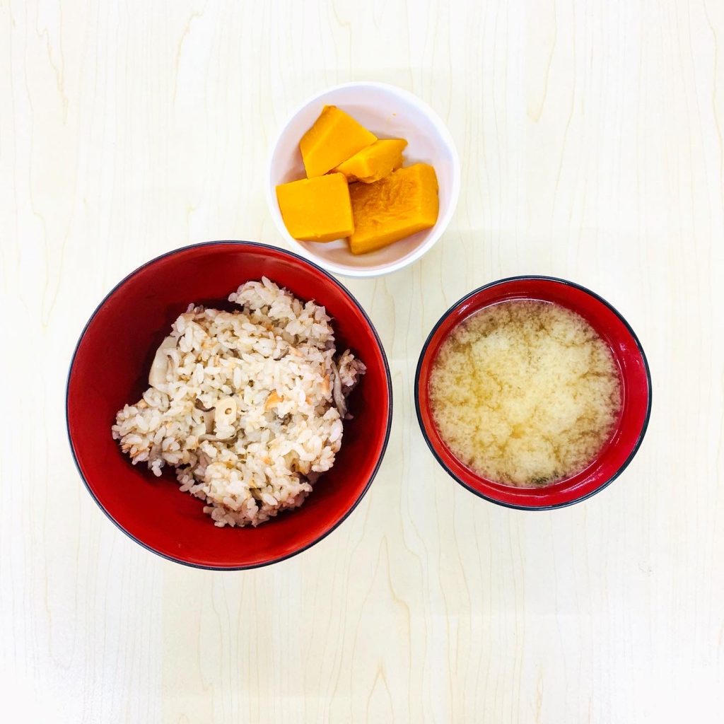 本日の献立:鮭の炊き込みご飯、わかめのお味噌汁、かぼちゃの煮物