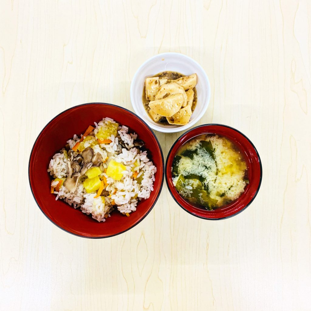 本日の献立:さつまいもご飯、わかめと玉子のお味噌汁、長芋と塩昆布の和え物