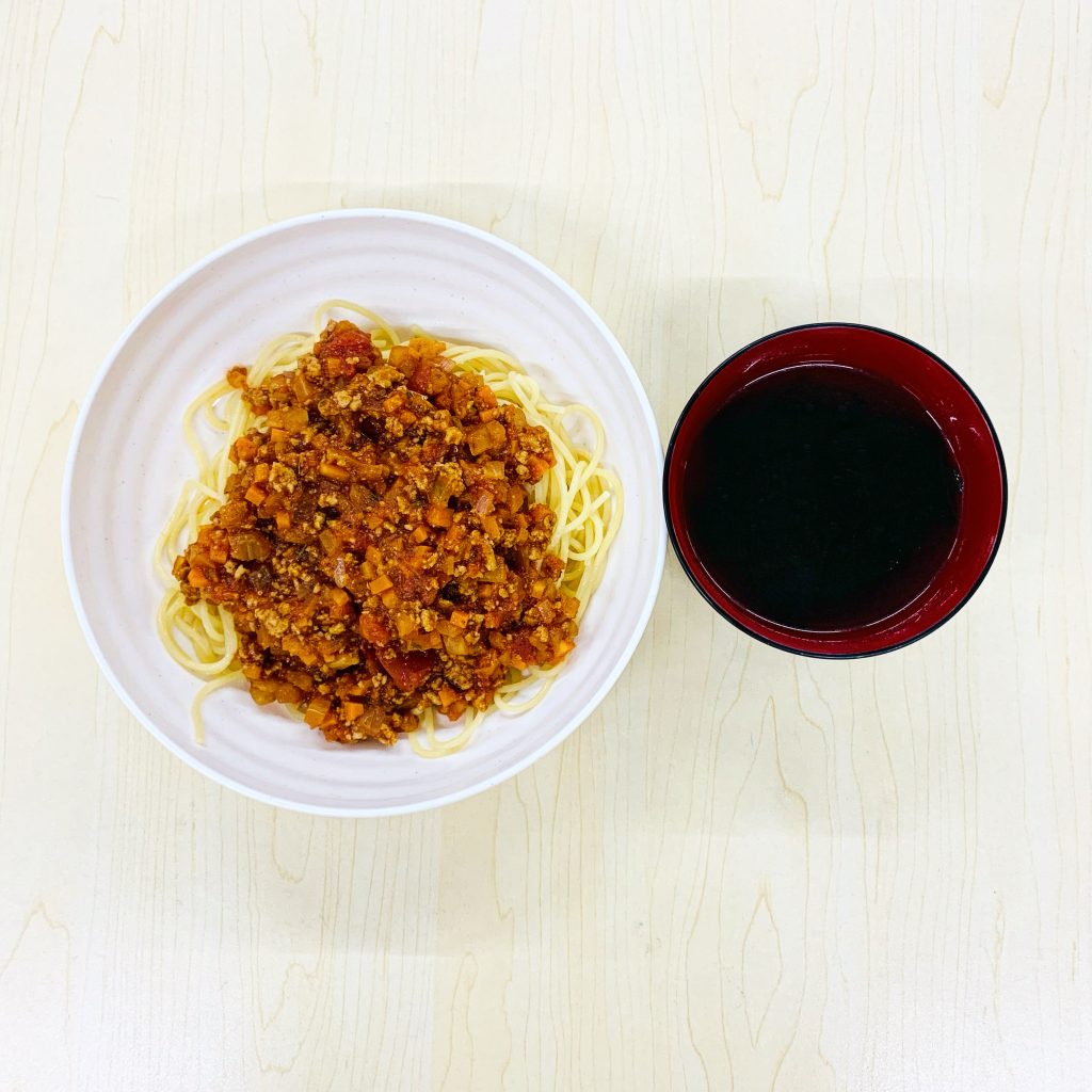 本日の献立:ミートソースパスタ、わかめスープ
