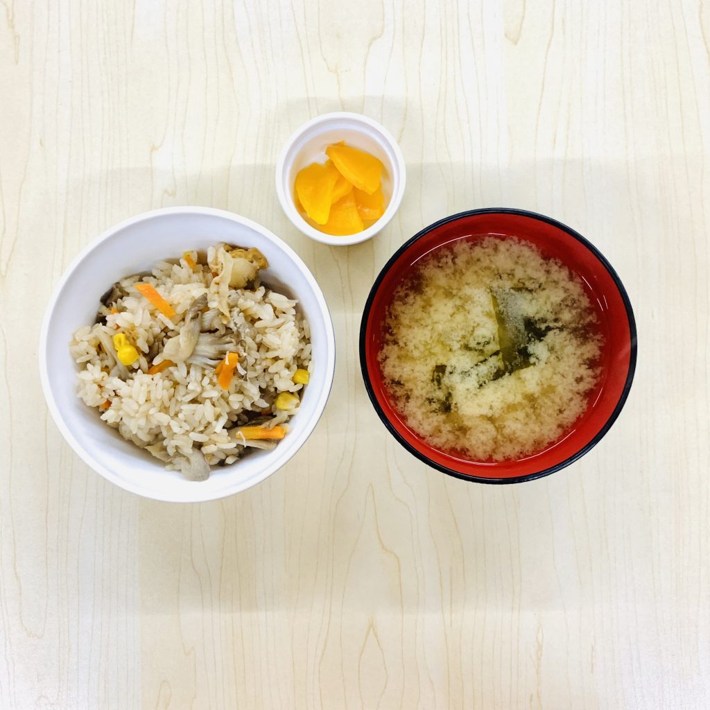 本日の献立:ほたての炊き込みご飯、わかめのお味噌汁。つぼ漬け