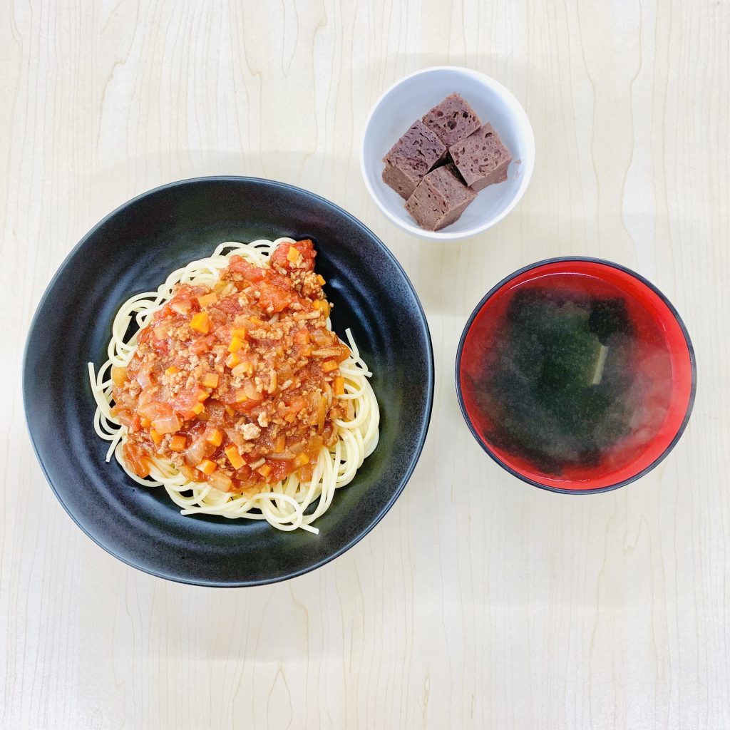 本日の献立:ミートソースパスタ、ワカメスープ、ウエハースケーキ