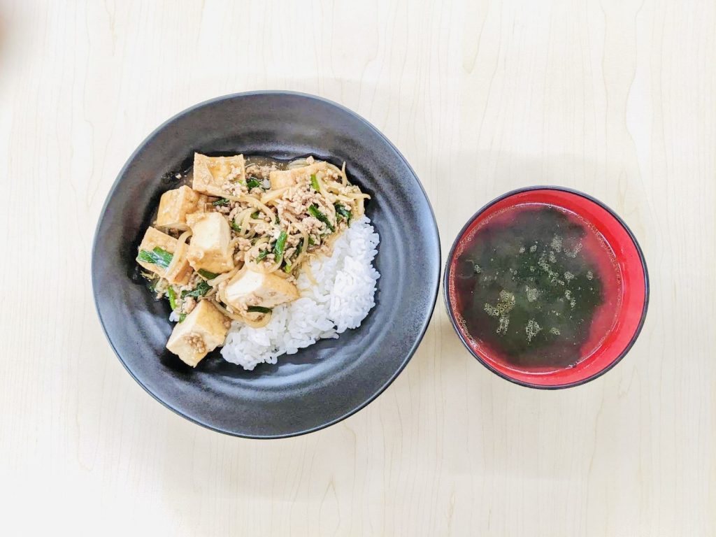 本日の献立:ひき肉と厚揚げのあんかけ丼、わかめスープ