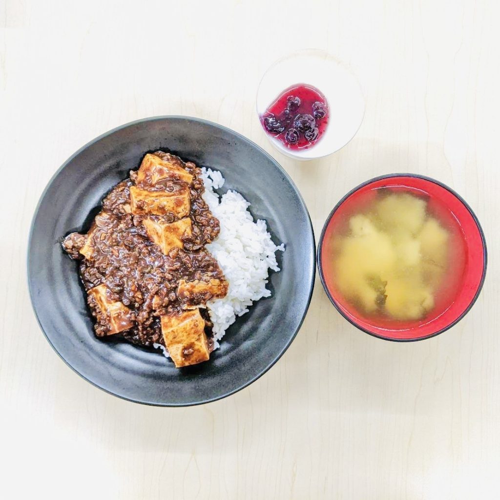 本日の献立:麻婆豆腐丼、わかめのお味噌汁、ブルーベリーミルクプリン