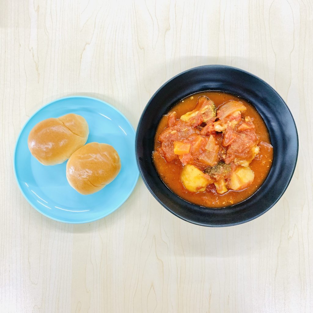 本日の献立:チキンと野菜のトマト煮、バターロール