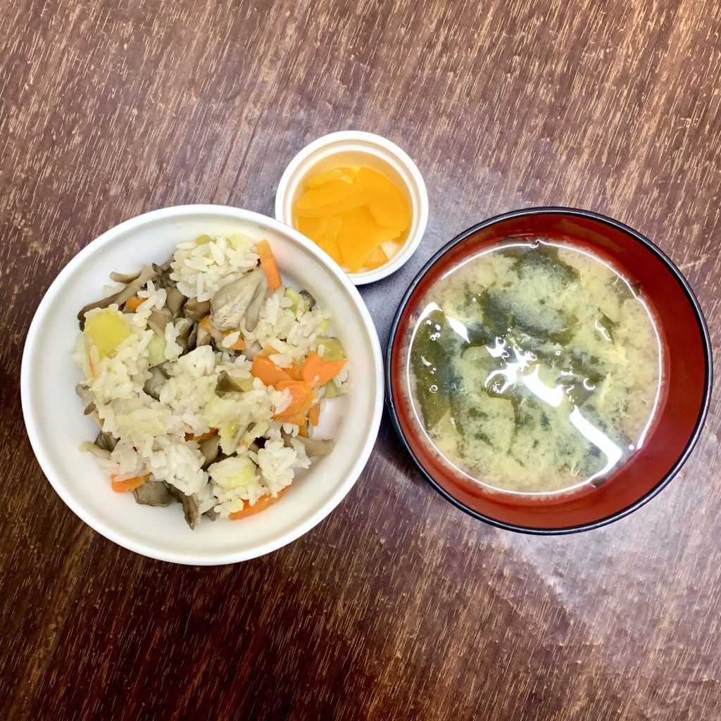 本日の献立:サツマイモご飯、わかめと玉子のお味噌汁、つぼ漬け