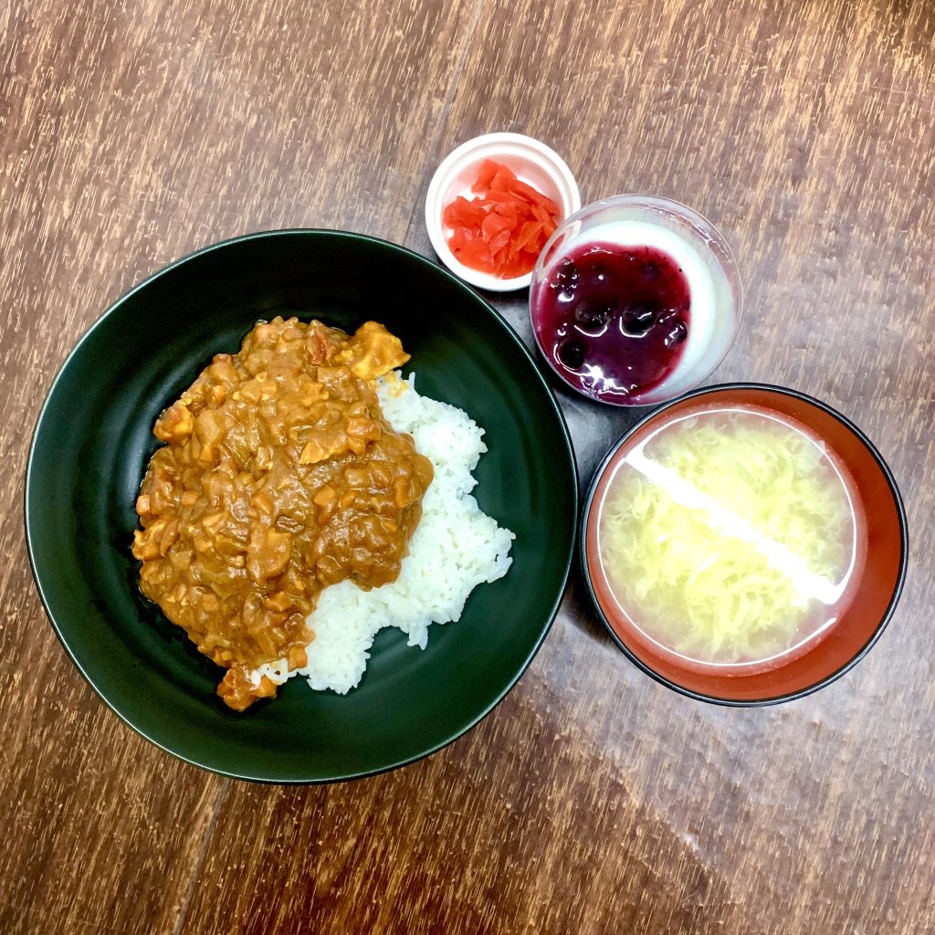 本日の献立:カレーライス、玉子スープ、福神漬け、ブルーベリーミルクプリン
