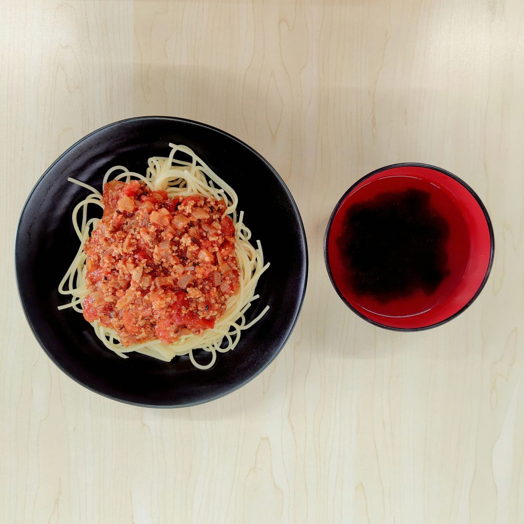 本日の献立:ミートソースパスタ、わかめスープ