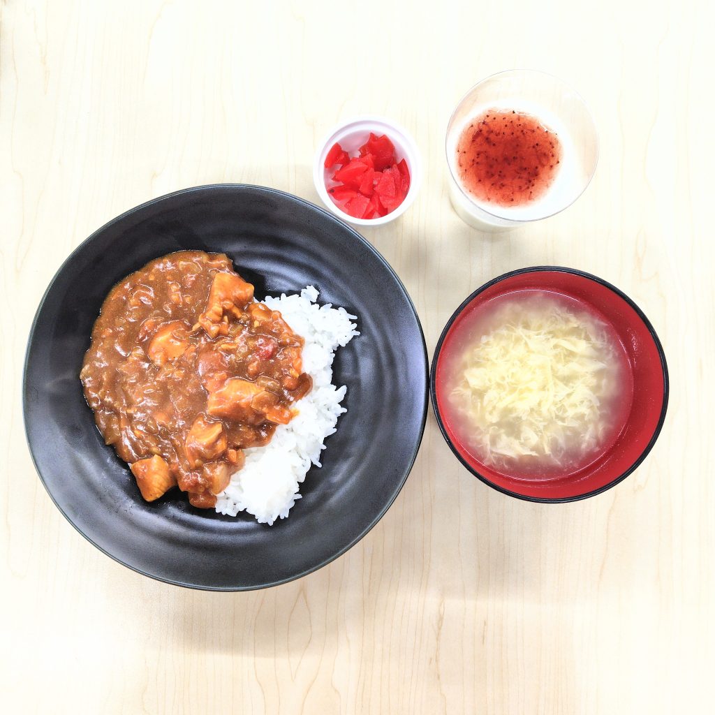 本日の献立:カレーライス、玉子スープ、福神漬け、いちごミルクプリン